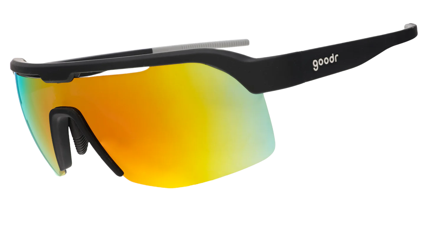 Diese schwarze Shield-Sonnenbrille mit halbhohem Rahmen und orangefarbenen, reflektierenden Gläsern verrutscht nicht und springt nicht auf, wenn du den Ball spikest und anschließend einen legendären Siegestanz in der Endzone hinlegst, der nur als Twerkout bezeichnet werden kann.